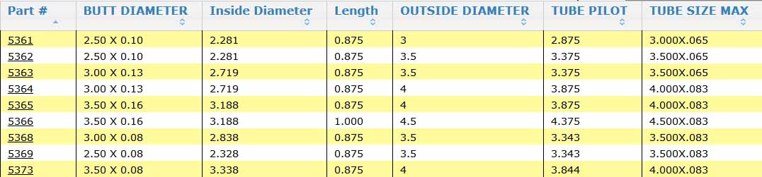 - Handy item when trying to install mismatched weld yokes, splines or CV stud yokes into a tube of the wrong size. For example....these handy bushings will allow you to install a spline made for a 3 inch .083 wall tube into a 4 inch .065 wall tube. The chart will help you to decide which bushing to use to make the mismatched parts fit your tube size. You can also machine the ID and or the OD to match whatever size you want. They are easy to use by welding the yoke or spline into the bushing ID and then you weld the assembled yoke and bushing OD into the tubing.